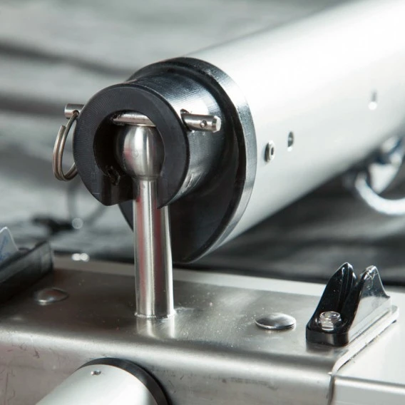 Neu und innovativ ist das Mastfuß-Kugelgelenk. Auch bei wenig Wind dreht der Mast sehr leicht mit dem Segel mit und verbessert so das Gesamtprofil. Mit dem Rotationsbegrenzer kann die Mastdrehung für Leicht- bis Starkwind begrenzt werden und das Großsegel flach oder bauchiger gefahren werden. Für besten Trimm bei jedem Wind. Das praktische Mastfußgelenk erleichtert zudem das Aufrichten des Masts, der von nur einer Person aufgestellt und umgelegt werden kann.