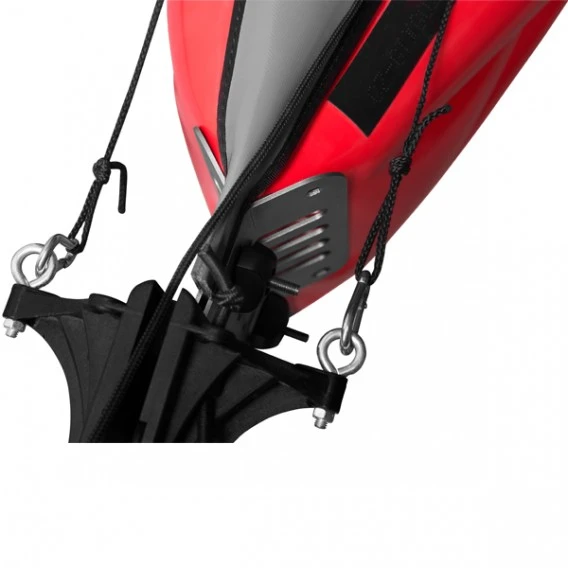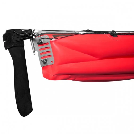 Das Ruder wird mit Schrauben am Heck befestigt und die Steuerseile durch die Pedale geführt. Das Steuerblatt kann während der Fahrt bei Bedarf hochgeklappt werden. Pedale sind an einem Stemmbügel befetstigt. Dieser wird im Boot montiert.